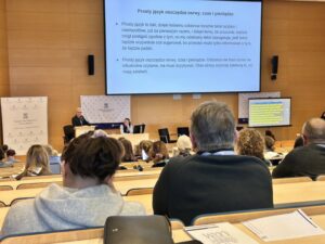 Prof. UAM dr hab. Jarosław Liberek w swoim wystąpieniu odniósł się do zagadnienia prostego języka jako najstarszego i niezawodnego sposobu na porozumienie. Wyjaśnił uczestnikom, że prosty język to taki, dzięki któremu odbiorca rozumie tekst szybko i niekłopotliwie, już po pierwszym czytaniu. Dzięki temu, że zrozumie treść przekazu, będzie mógł postąpić zgodnie z tym, co mu przeczytany tekst zasugeruje, o ile tekst będzie coś sugerował, bo przecież może dostarczać tylko jakiejś informacji – na przykład takiej, że będzie padał deszcz. Nie jest sztuką mówić w sposób skomplikowany o skomplikowanych problemach. Sztuką jest mówić w sposób prosty o skomplikowanych problemach. Przeciętny człowiek – jak podkreślił profesor – o wiele mniej ceni kogoś, kto posługuje się długimi zdaniami, w których pełno trudnych, naukowych określeń, a o wiele bardziej ceni kogoś, kto potrafi prosto wytłumaczyć. Prosty język niweluje bariery w komunikacji, oszczędza czas, zmniejsza stres powodowany niezrozumiałością przekazu, buduje zaufanie. Stosowanie prostego języka przez uczelnie, w komunikacji z pracownikami i studentami, pomaga w odczytywaniu, rozumieniu oraz wykorzystywaniu przekazywanych informacji.