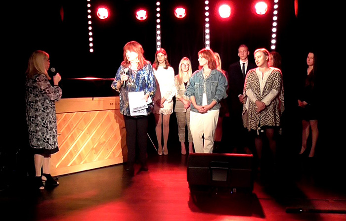 Jurorzy i dziennikarka Beata Tomanek wraz z finalistami. Przewodnicząca Jury Danuta Błażejczyk odpowiada na pytania dziennikarki