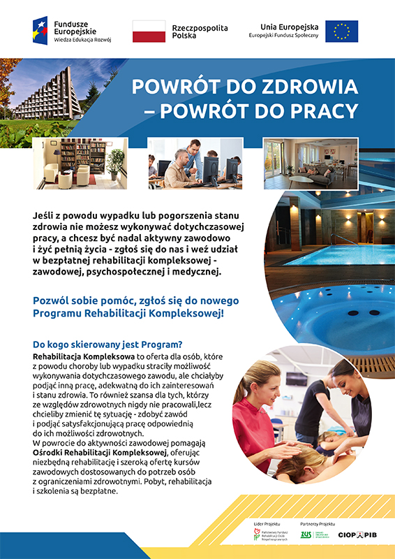 Kompleksowa rehabilitacja to nowe na gruncie polskim rozwiązanie, mające na celu ułatwienie podjęcia lub powrotu do pracy osobom, które wskutek doznanego urazu lub choroby w różnych okresach życia utraciły zdolność do pracy. Głównym celem programu jest uzyskanie zatrudnienia przez jego uczestników lub uruchomienie przez nich działalności gospodarczej, dlatego główną rolę odgrywa tu moduł zawodowy. Proponowane w ramach tego modułu szkolenia zawodowe, kończą się egzaminem i przyznaniem certyfikatu.