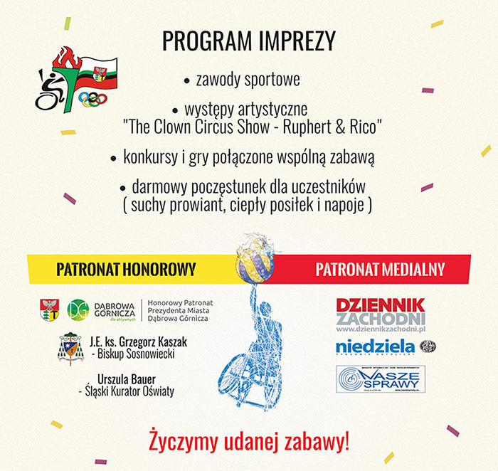 Do Dąbrowy Górniczej zjadą się osoby niepełnosprawne pochodzące ze szkół, ośrodków, WTZ, ZAZ, ŚDS, DPS, itp. z terenu województwa śląskiego, małopolskiego, opolskiego i świętokrzyskiego, by wspólnie się bawić rywalizując w różnorodnych konkurencjach sportowych.